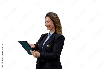 Businesswoman smiling, holding a digital tablet, managing business with technology. Transparent background