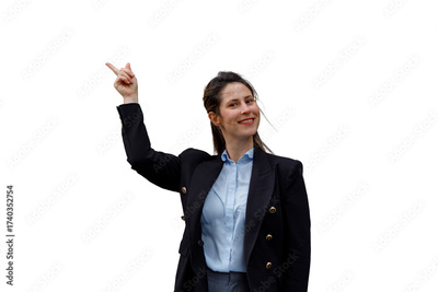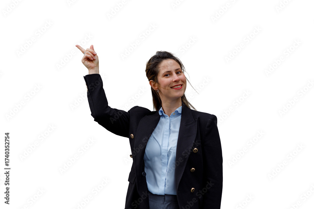 Businesswoman smiling, pointing finger up, indicating direction, showing information, presenting solution on transparent background