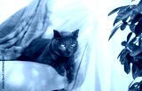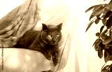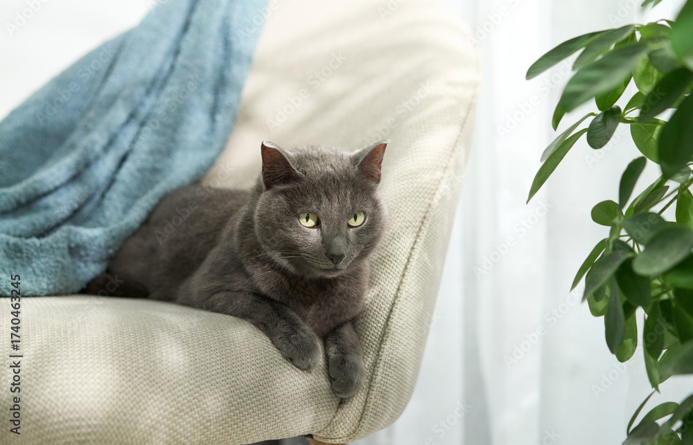 Gray feline resting on blue throw on indoor chair next to tall plants