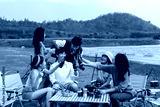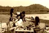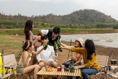 Group of young Asian friends enjoying outdoor camping by the lake, sharing drinks, playing guitar, and cooking food together in a fun and relaxing atmosphere with nature and mountain background.