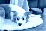Dog lies on a round white carpet next to a brown sofa. Room lighting and composition are calm and cozy.