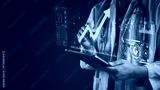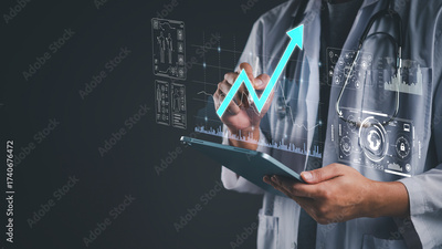 Doctor using tablet analyze patient data on virtual screen. Medical technology shows health data analytics, growth chart success. Healthcare innovation for future diagnosis and treatment concept.