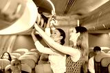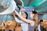 Scene of inside airplane with airhostess help passenger to keep the luggage to overhead storage with service mind in airline business professional.