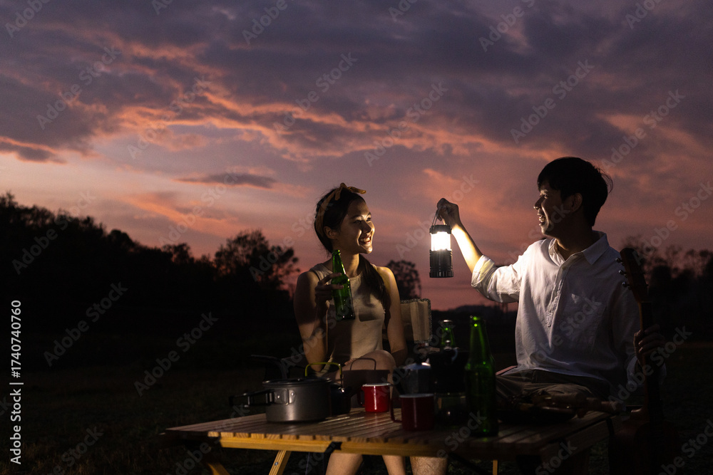 Man and woman enjoying night camping under twilight sky, smiling and holding lantern and drinks at a wooden table, surrounded by camping gear in a peaceful outdoor
