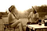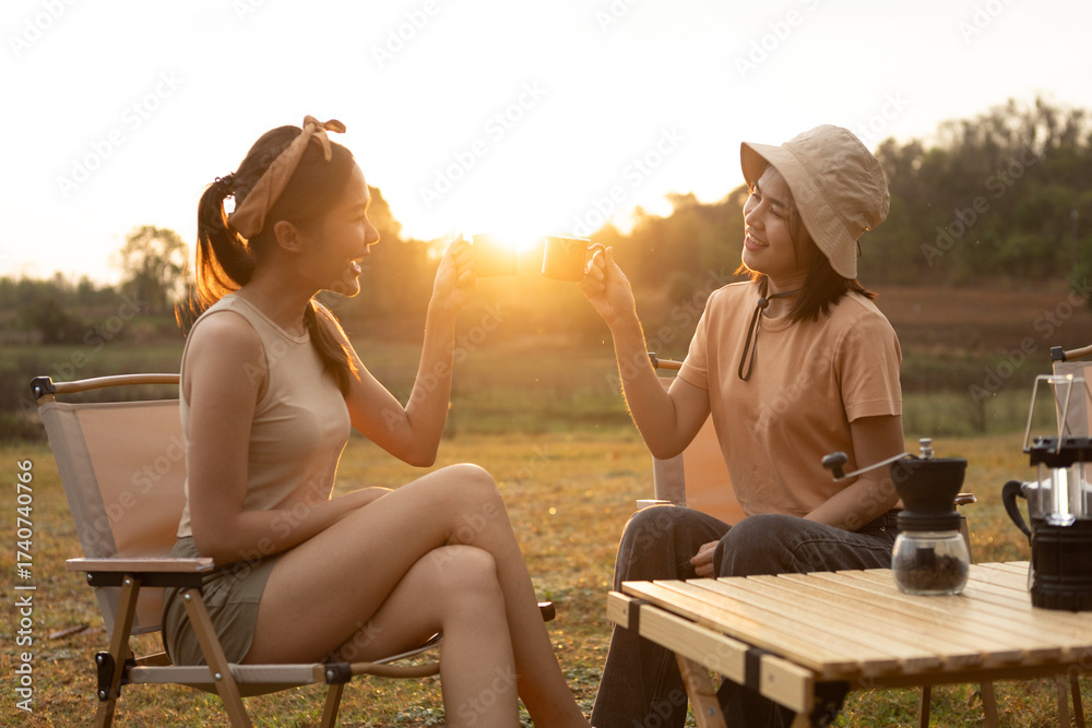 Two women camping and enjoying coffee at sunrise, sitting on outdoor chairs with camping gear on a wooden table, celebrating a peaceful morning in nature with cheerful smiles.