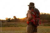 Women traveler with a backpack looking at sunrise in nature, dressed in outdoor hiking outfit, symbolizing freedom, adventure, and peaceful solo travel during golden hour.