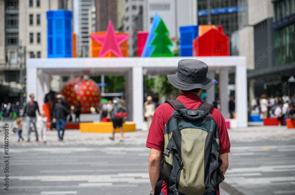 Tourist walking in the city centre with Christmas decorations. Unrecognizable crowds in the background. Auckland.