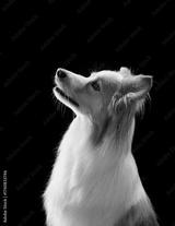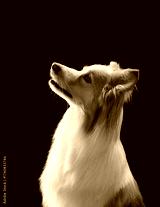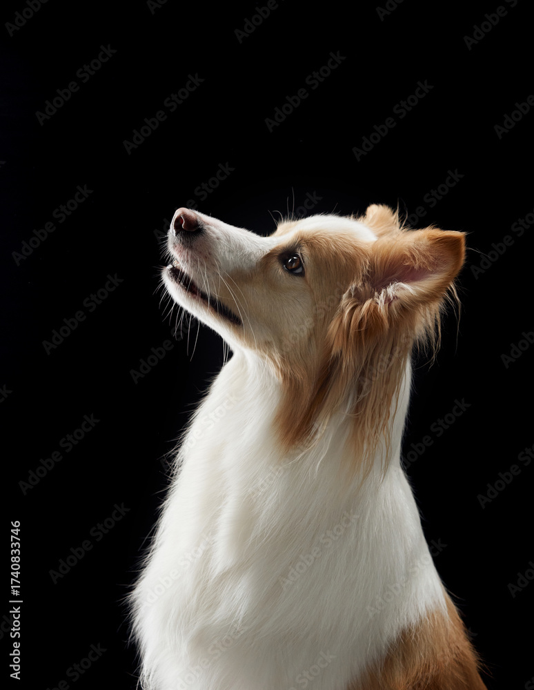 Border collie is captured from a side angle while looking up. Lighting accentuates the dog's nose and profile.