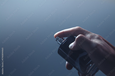 Close-up of a man's hand holding an electronic cigarette over a dark background