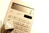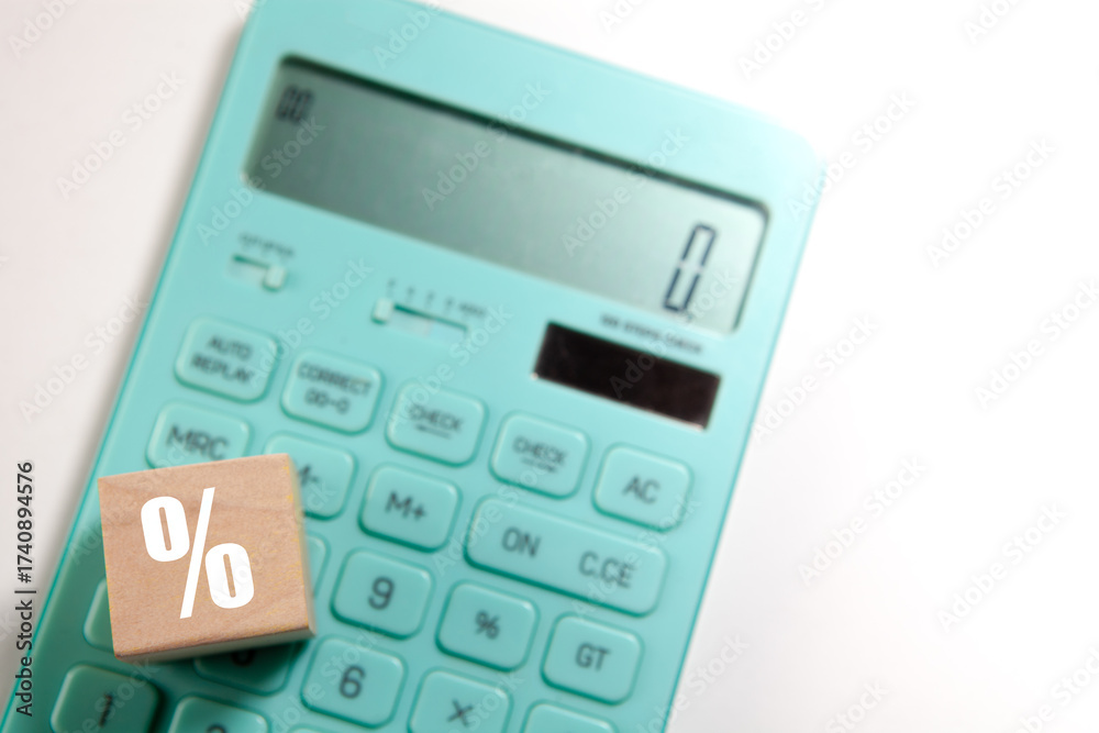 Calculator and wooden cube with percentage symbol on white background.