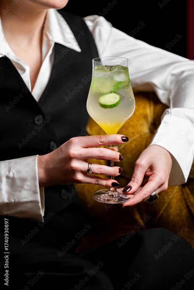 Stylish person holding a cucumber cocktail in a stemmed glass, seated on a mustard yellow chair. Dark nails, rings, and formal outfit create a modern, elegant lifestyle vibe.