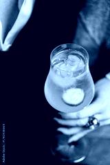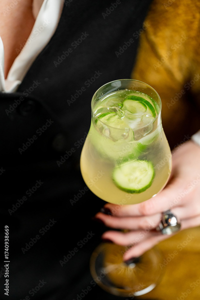 Close-up of a hand holding a cocktail glass with cucumber garnish and ice cubes. Stylish attire and mustard background suggest a refined, relaxed lifestyle moment.