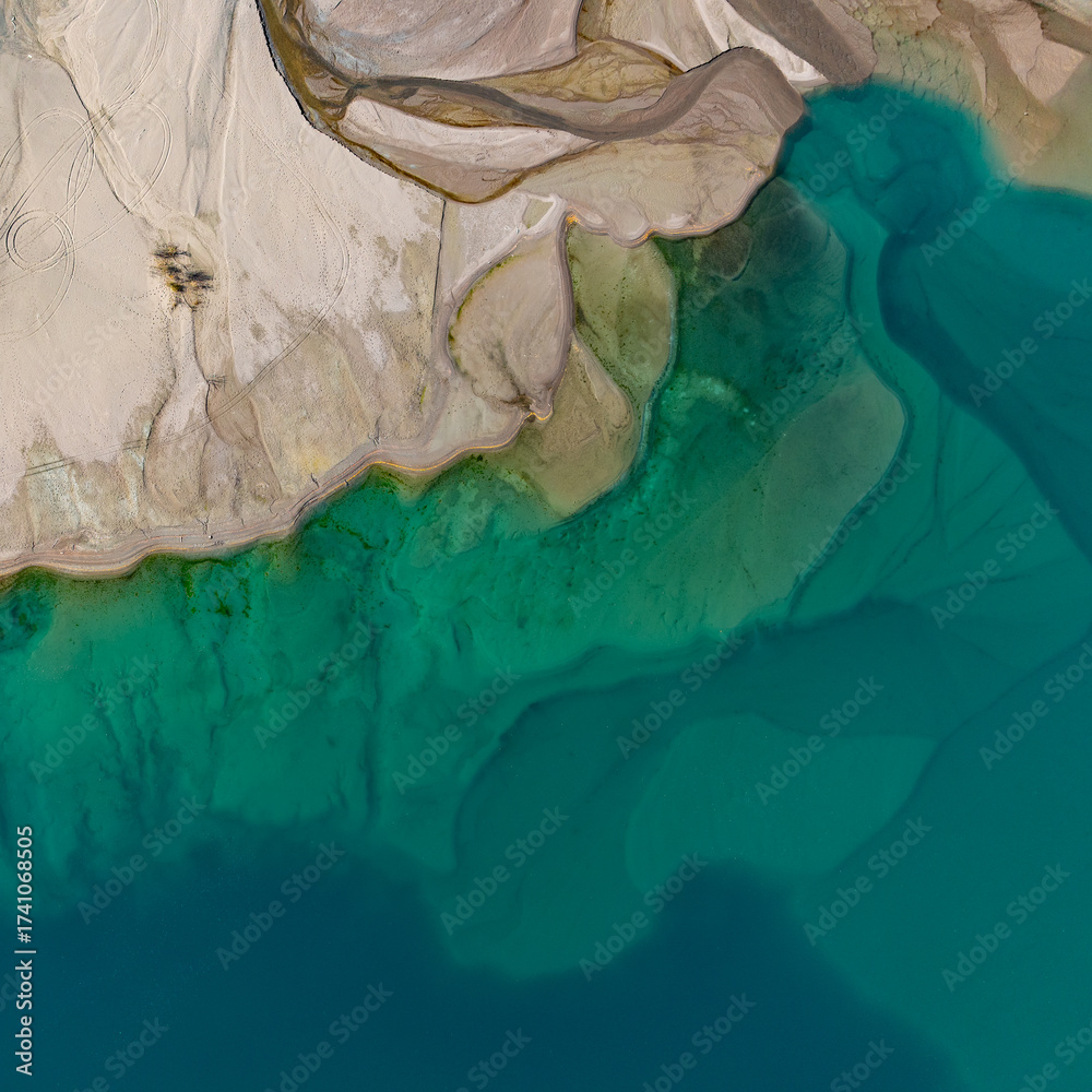 A quadcopter view of Lake Issyk (Almaty Region, Kazakhstan) and the mountain river flowing into it on an autumn morning.