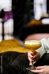 Close-up of a woman's hand holding a coupe glass with a frothy yellow cocktail in a lounge setting. Elegant drink presentation, dark manicure, blurred plush background.