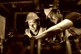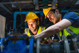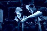 Engineers inspecting industrial pipeline system underground