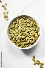 Top view of dry pumpkin seeds in bowl healthy food