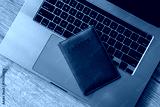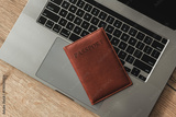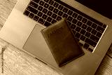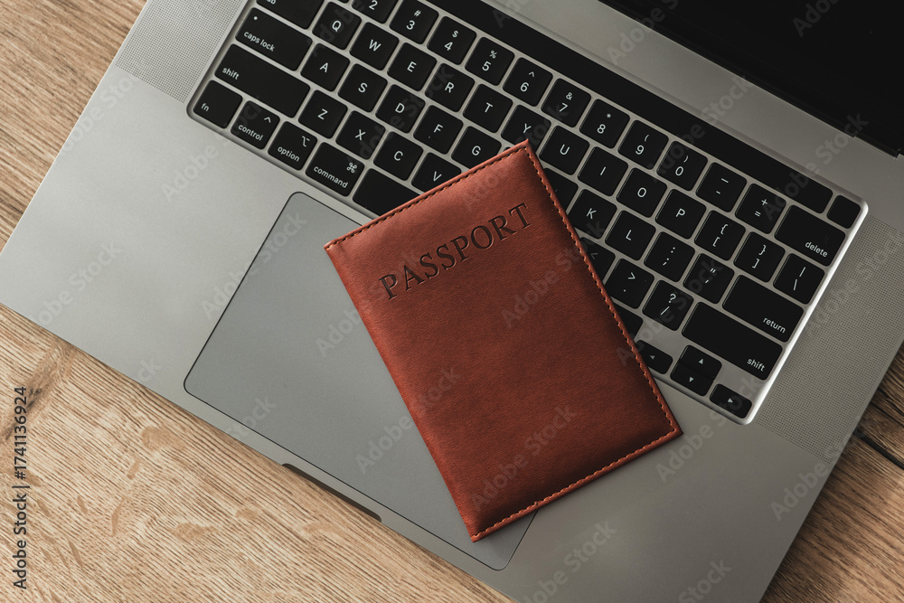 Close-up of a brown leather passport cover placed on a laptop keyboard