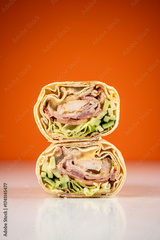 Chicken shawarma wrap with vegetables on orange background