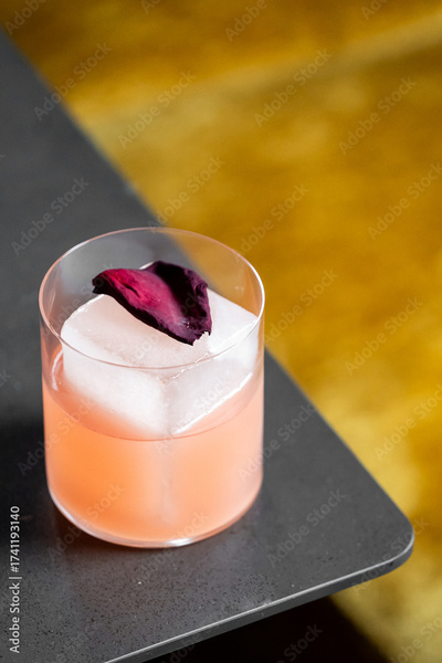 Elegant pink cocktail with large clear ice cube and dark flower petal garnish, served in a transparent glass on a dark surface with warm yellow background. Minimalist and refined.