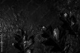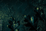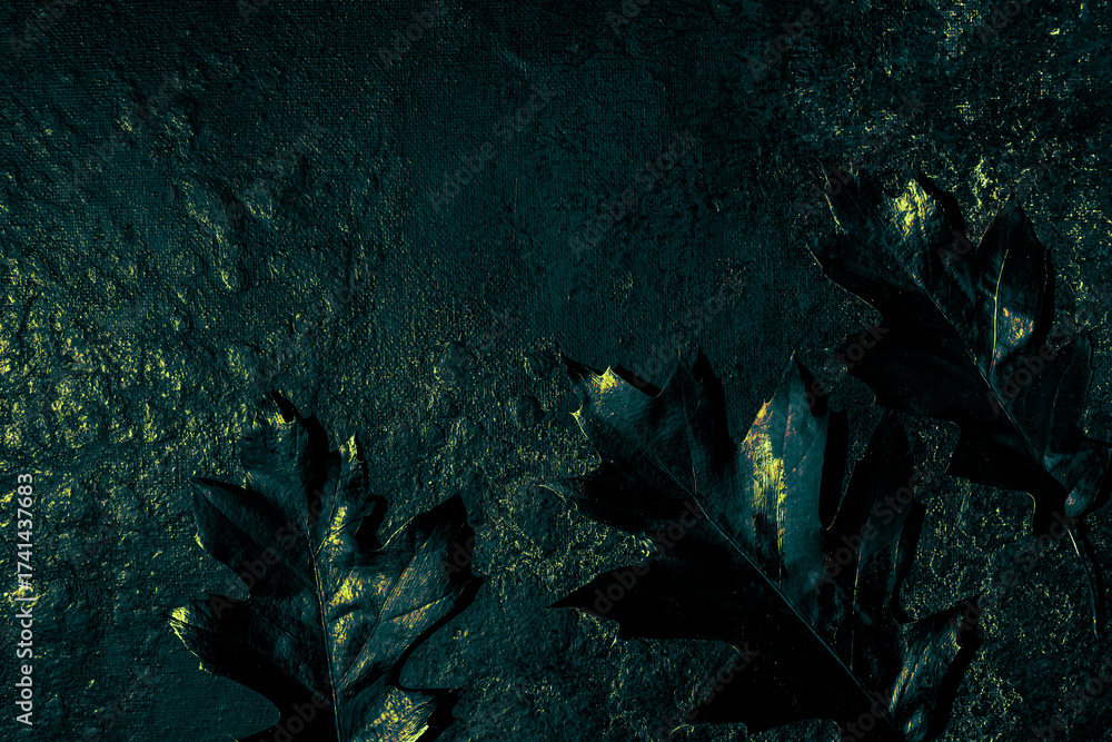 Dark oak leaves on textured surface with deep green and gold lighting, dramatic shadows, moody autumn background, space for text, horizontal composition. Copy space, Black halloween