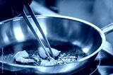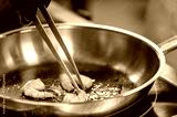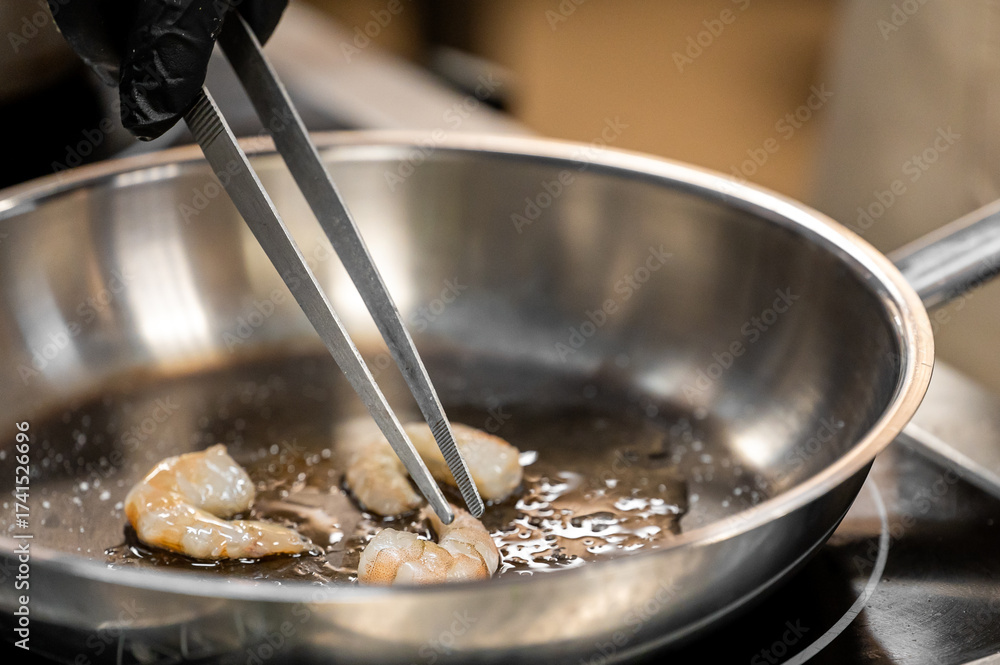 Chef using tongs to cook fresh shrimp in hot oil on a stainless steel pan. Close-up of seafood preparation in professional kitchen. Culinary process, sizzling, early cooking stage