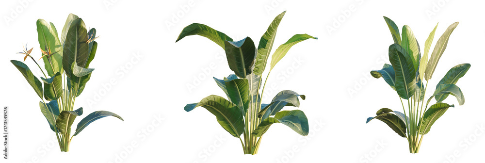 Strelitzia reginae tree cutout, front view, transparent background, isolate, Lush Bird of Paradise plants with vibrant green leaves and exotic blooms