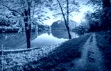 Scenic autumn view of a river with mountains reflected in calm water. Trees with golden foliage line a countryside path at sunset in Slovenia. Vibrant seasonal colors and peaceful nature in fall
