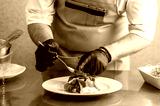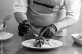 Professional chef plating gourmet dish in commercial kitchen, wearing gloves and apron, adding red garnish with spoon to elegant vegetable and sauce arrangement on white plate.