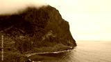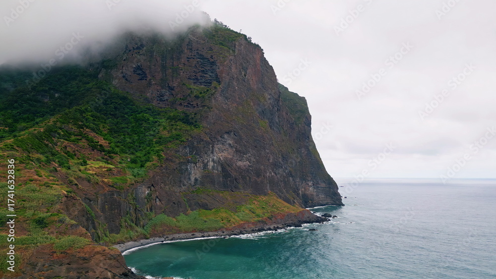 Drone massive cliff rising above ocean water. Green vegetation covering slopes.