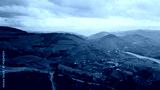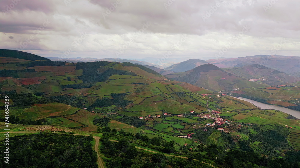 Countryside terraces spreading hills aerial view. Calm stream flowing hillside