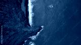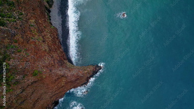 Drone rocky coastline washed blue ocean water. Picturesque waves splashing stone