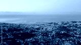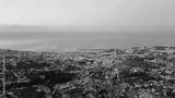 Aerial picturesque coastal city at evening. Red rooftops stretching urban slope.
