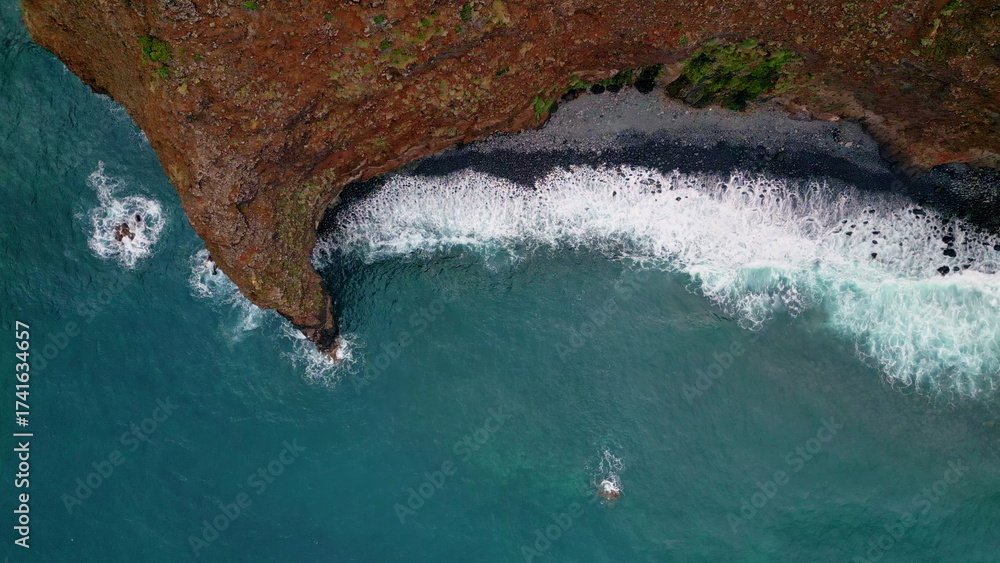 Top waves splashing rocks making white foam. Beautiful water crashing of cliffs