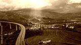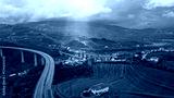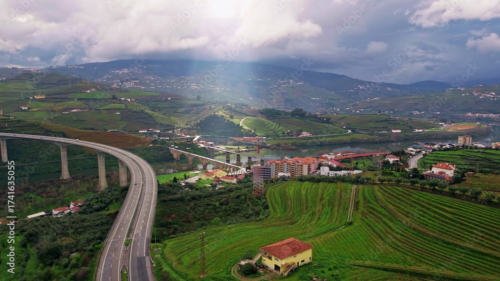 Aerial cloudy countryside scenery with settlement placed on vivid green slopes.