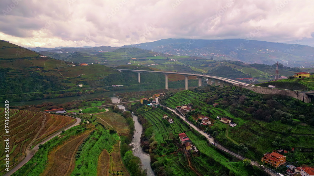 Scenic panorama rural nature under cloudy sky. Aerial view agricultural fields