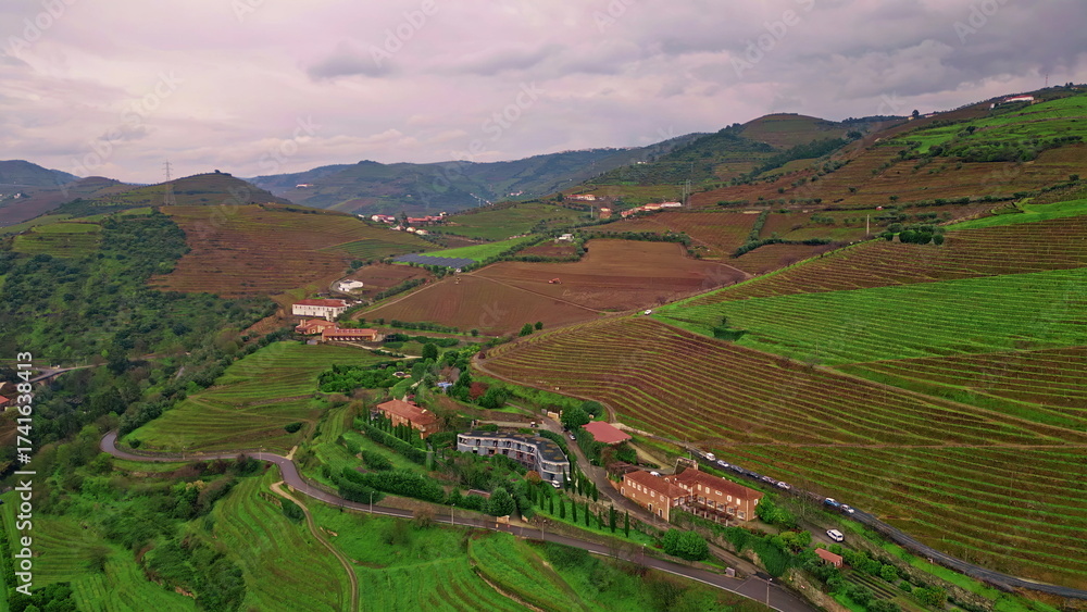 Panorama terraced fields stretching mountain hillside in rural valley drone view
