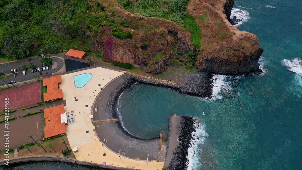 Aerial natural pools Porto Moniz on Madeira island. Popular tourist attraction