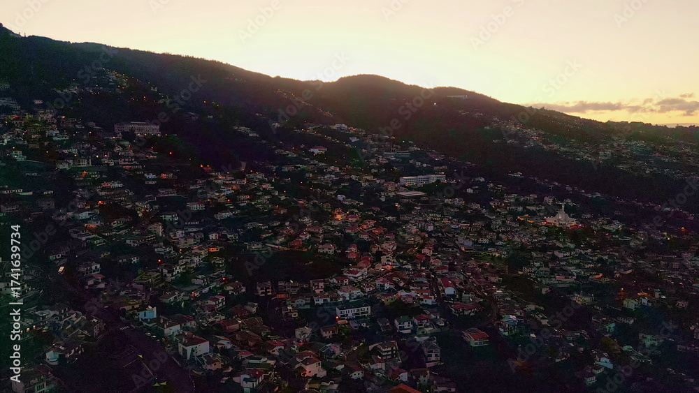 Bright sunrise shining hills covered with cozy town streets. Orange morning
