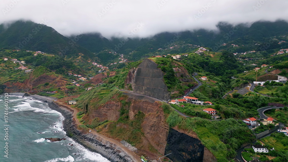 Breathtaking rocky shore drone view. Lush greenery covering mountain hills