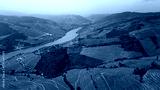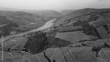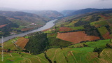 Drone picturesque terraced hills shape dramatic countryside scene. River flowing
