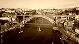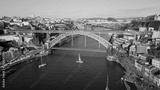 Drone steel bridge Porto stretching over Douro river. Historic monument Dom Luis