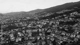 Aerial dense houses orange roofs in Mediterranean town. Picturesque town pattern
