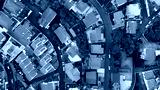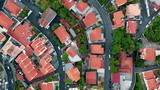 Red tiled houses cluster along road network. Drone view neighborhood structure