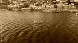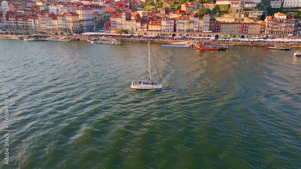 White yacht drifting river by beautiful Portugal town with tiled roof houses.