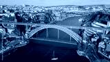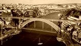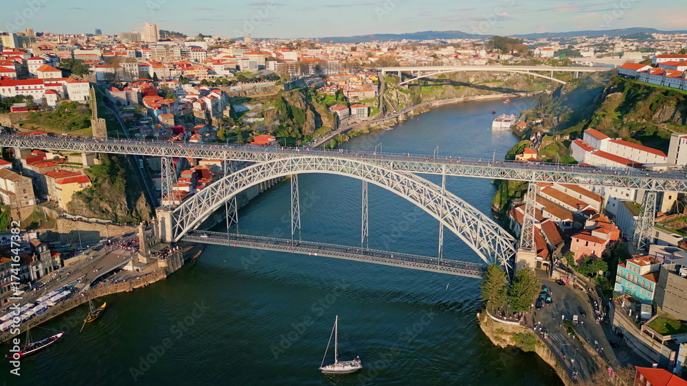 Drone bridge Douro river in Porto with sailing beautiful yachts. Arch symbol