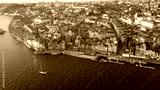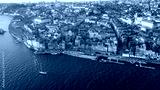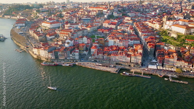 Coastal Portugal city standing on river sunny day drone view. Cozy district