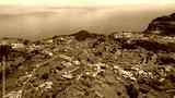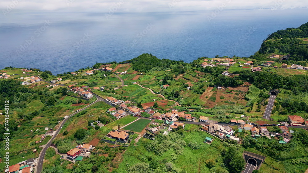 Cozy coastal village sunny day drone view. Wonderful panorama green terrain