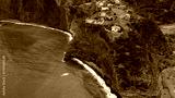 Buildings placed coast rock over beautiful ocean drone view. Small settlement
