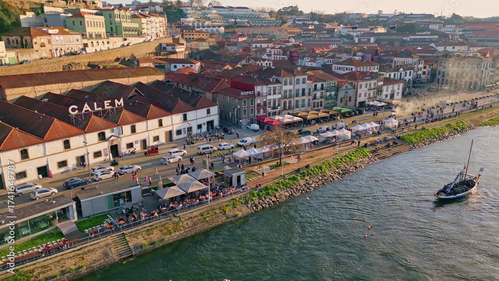 Drone wonderful coastal city standing on beautiful river with floating boats.