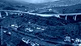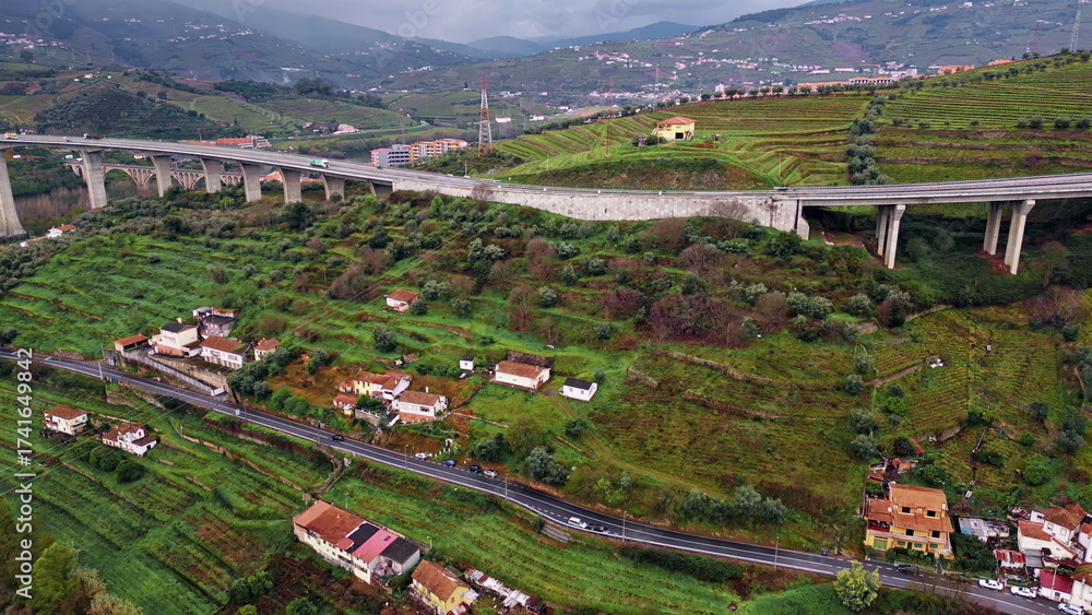 Highway curving green farmland on hillside. Drone concrete bridge countryside